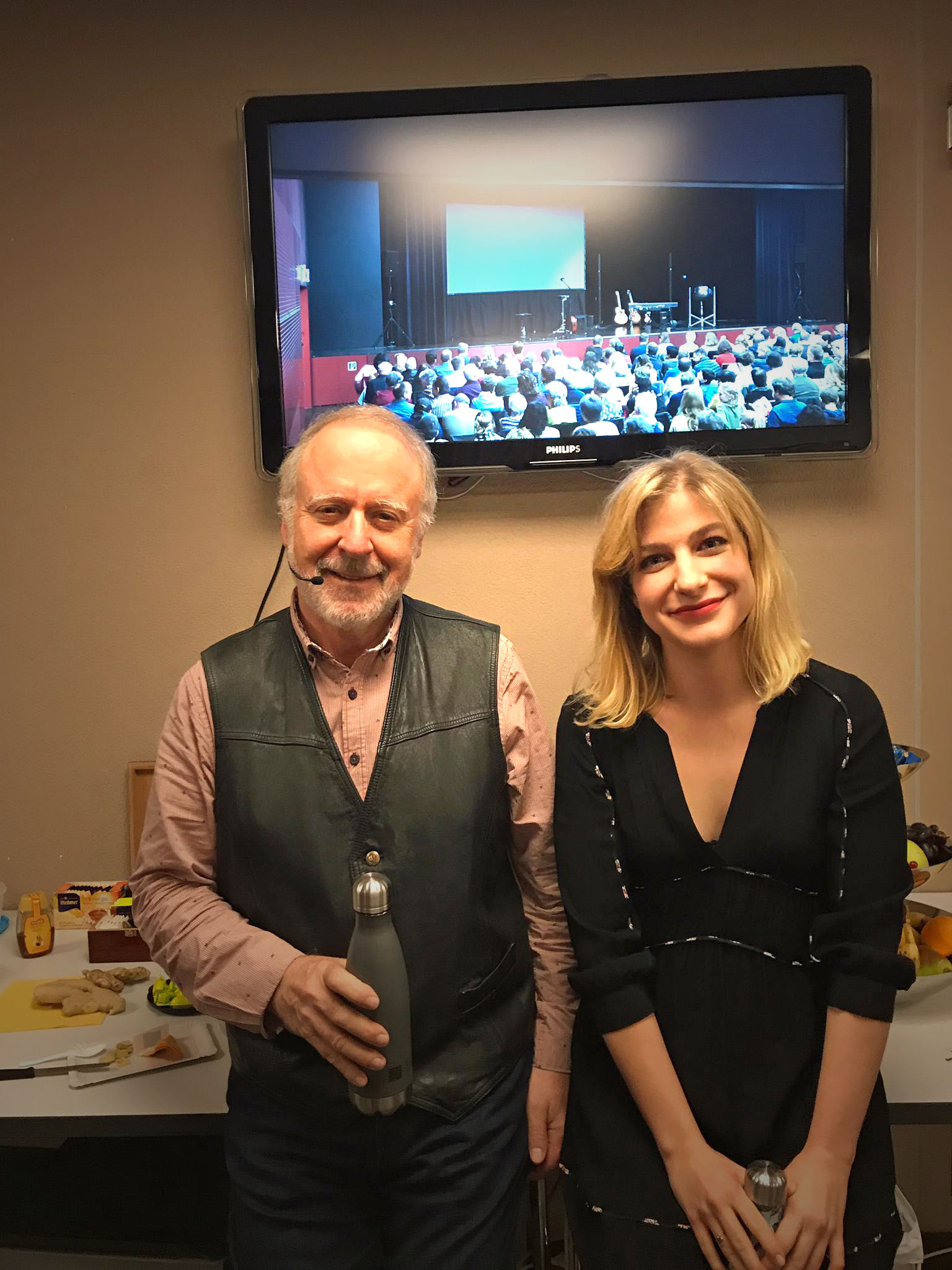 Das Foto ist ein Schnappschuss aus der Garderobe in Wolhusen. Das Publikum wartet bereits im Saal – siehe Bildschirm – und wir sind bereit. Gleich kann’s losgehen.